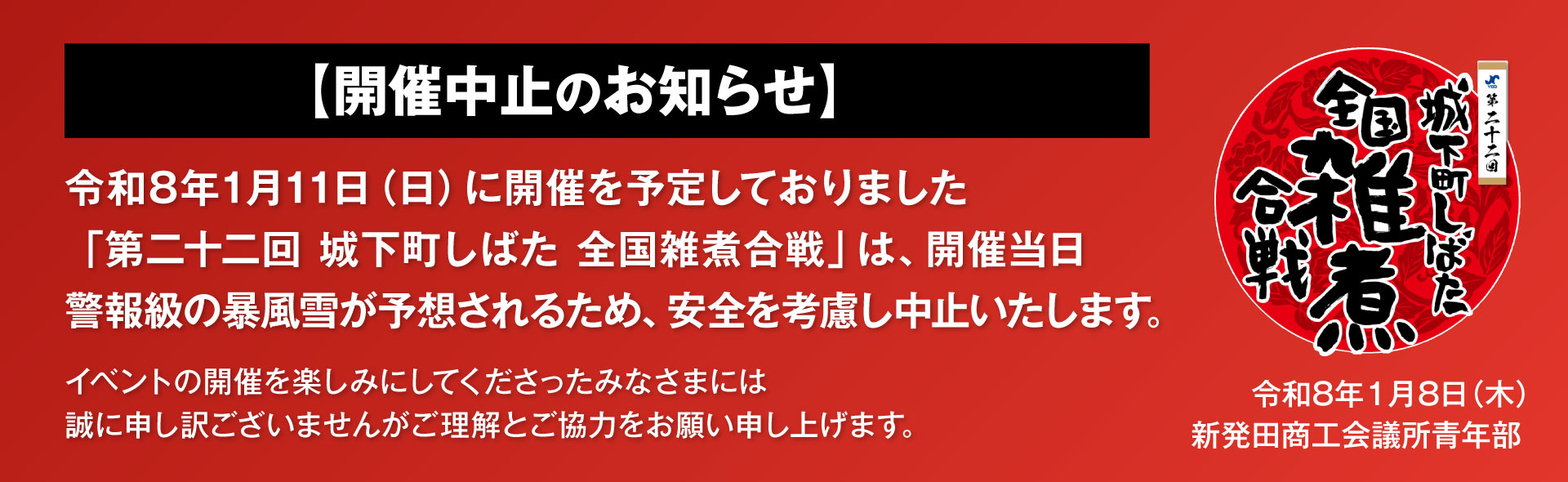 【2026年も開催決定!!】第二十二回 城下町しばた全国雑煮合戦日本最大級の雑煮フェス『城下町しばた全国雑煮合戦』が2026年も開催決定!第22回となる今回も寺町通りや諏訪神社など観光名所に囲まれた蔵春閣周辺で開催。会場には創意あふれる雑煮が集結!味わって、巡って、新発田の冬をご満喫ください。 開催日/2026年1月11日(日) 時間/10:00~15:00(予定)