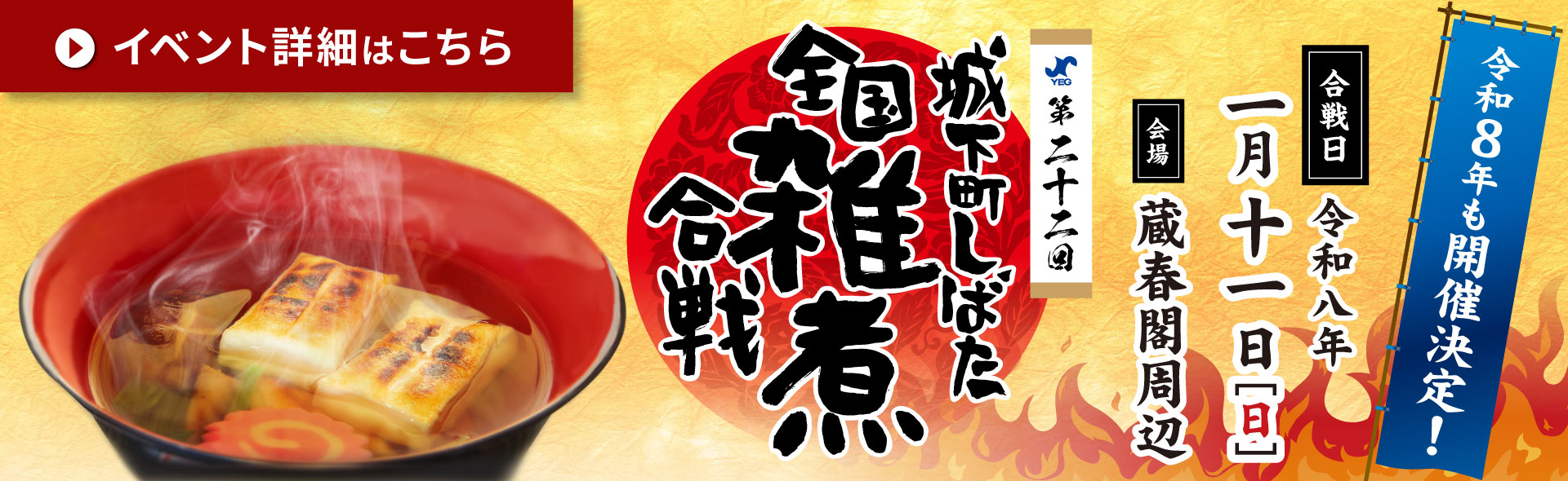 【2026年も開催決定!!】第二十二回 城下町しばた全国雑煮合戦日本最大級の雑煮フェス『城下町しばた全国雑煮合戦』が2026年も開催決定!第22回となる今回も寺町通りや諏訪神社など観光名所に囲まれた蔵春閣周辺で開催。会場には創意あふれる雑煮が集結!味わって、巡って、新発田の冬をご満喫ください。 開催日/2026年1月11日(日) 時間/10:00~15:00(予定)